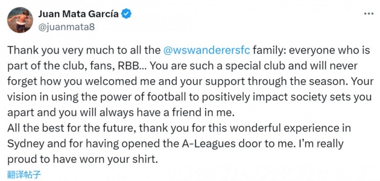 9月16日讯 西班牙中场马塔合同到期离开西悉尼漫步者,他在社交媒体上发文告别。