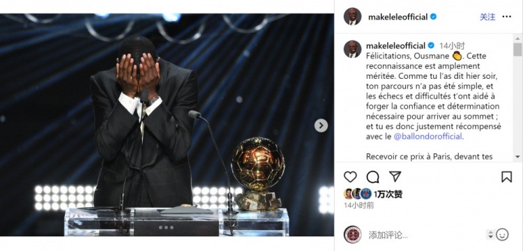 马克莱莱晒出登贝莱领奖的照片,配文:“祝贺你,奥斯曼。这份荣誉实至名归。正如你昨晚所说,你的成长之路并不平坦,挫折与挑战铸就了你登顶所需的自信与决心,因此金球奖的奖杯正是你应得的回报。在巴黎,在你的队友、朋友和家人的见证下获得这个奖项,让这个时刻变得更加特别。